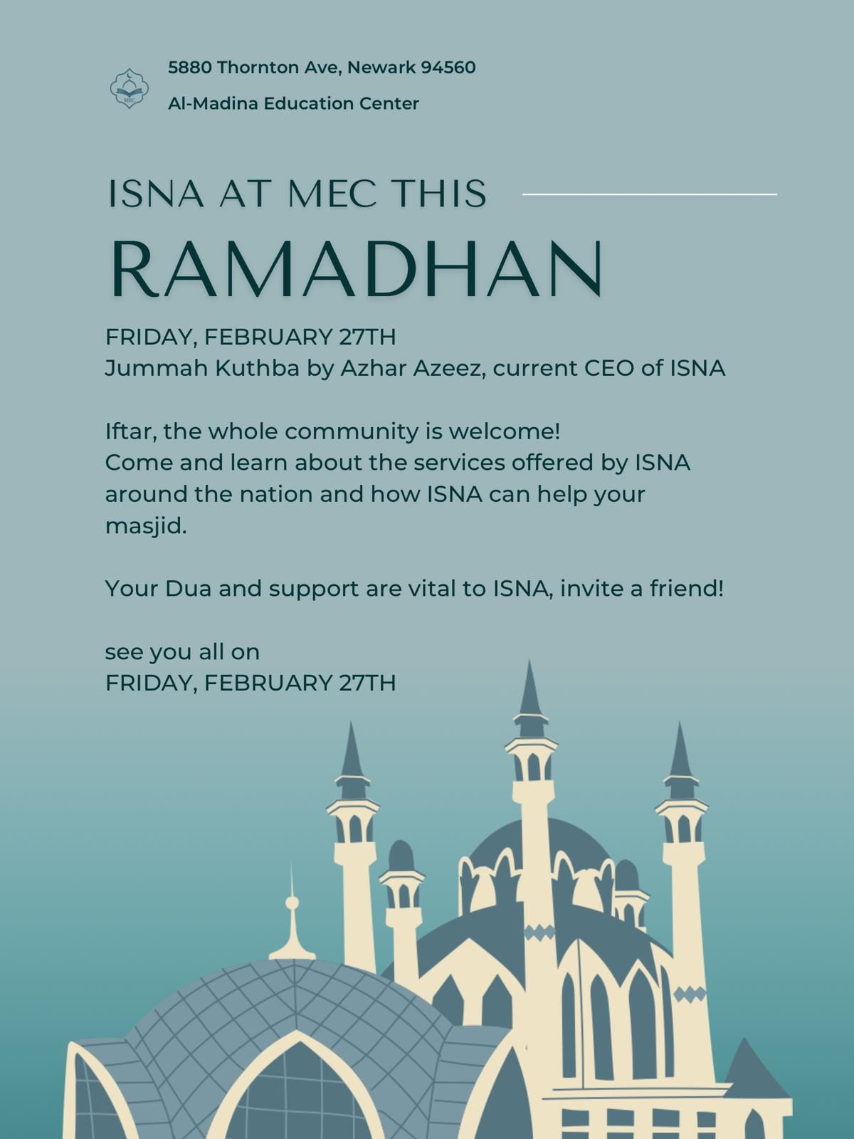 12 Feb 2026 1 min read ISNA CEO @ MEC Photo by Afdhal N. / Unsplash Join use for Iftar Friday February 27th. Azhar Azeez, the current CEO of ISNA will be joining us. Learn about the services offered by ISNA around the nation and how ISNA can help your masjid.
